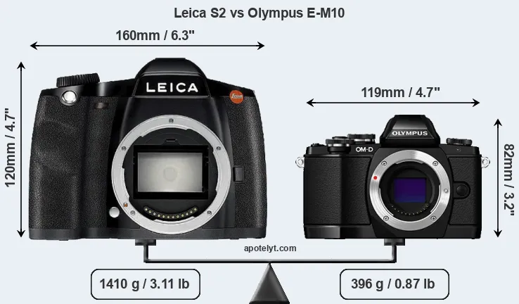 If the front view area (width x height) of the cameras is taken as an aggregate measure of their size, the Olympus E-M10 is considerably smaller (49 percent) than the Leica S2. Moreover, the E-M10 is substantially lighter (72 percent) than the S2. It is worth mentioning in this context that the S2 is splash and dust resistant, while the E-M10 does not feature any corresponding weather-sealing.
