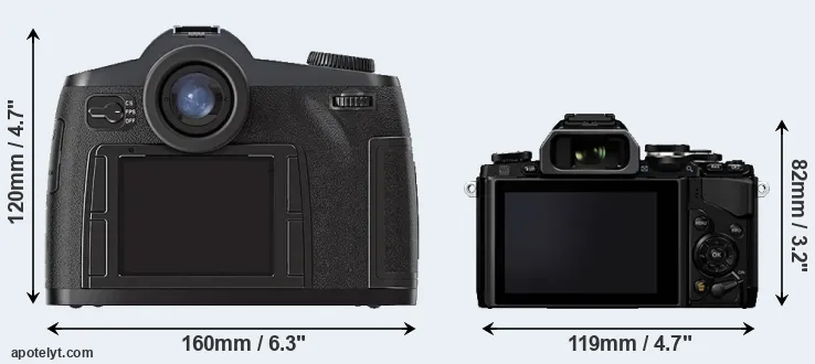 The physical size and weight of the Leica S2 and the Olympus E-M10 are illustrated in the side-by-side display below. The two cameras are presented according to their relative size. Three consecutive perspectives from the front, the top, and the back are available. All size dimensions are rounded to the nearest millimeter.
