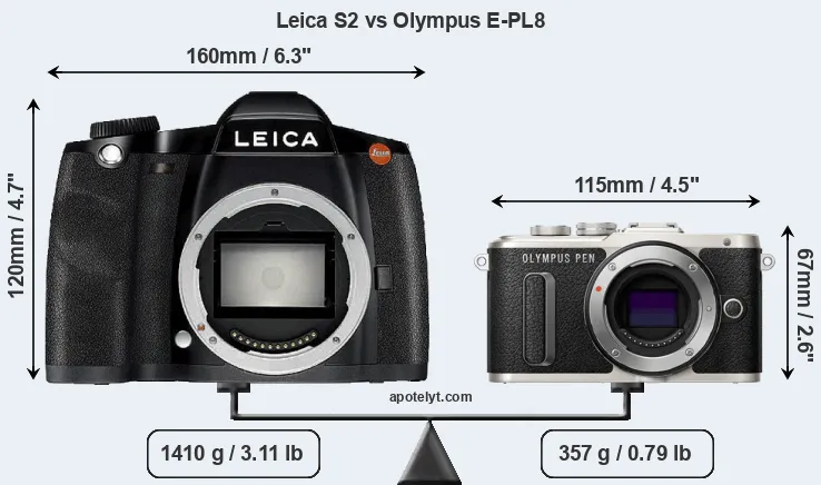 If the front view area (width x height) of the cameras is taken as an aggregate measure of their size, the Olympus E-PL8 is considerably smaller (60 percent) than the Leica S2. Moreover, the E-PL8 is substantially lighter (75 percent) than the S2. It is worth mentioning in this context that the S2 is splash and dust resistant, while the E-PL8 does not feature any corresponding weather-sealing.