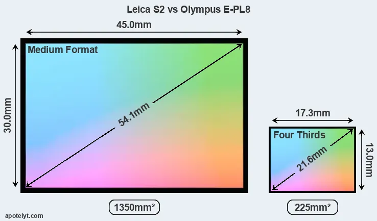 Of the two cameras under consideration, the Leica S2 features a medium format sensor and the Olympus E-PL8 a Four Thirds sensor. The sensor area in the E-PL8 is 83 percent smaller. As a result of these sensor size differences, the cameras have a format factor of, respectively, 0.8 and 2.0. The sensor in the S2 has a native 3:2 aspect ratio, while the one in the E-PL8 offers a 4:3 aspect.