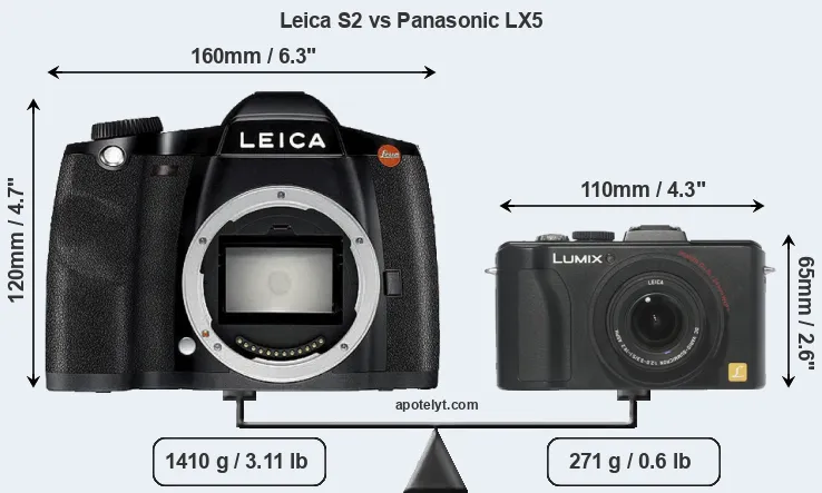 If the front view area (width x height) of the cameras is taken as an aggregate measure of their size, the Panasonic LX5 is considerably smaller (63 percent) than the Leica S2. It is worth mentioning in this context that the S2 is splash and dust resistant, while the LX5 does not feature any corresponding weather-sealing.