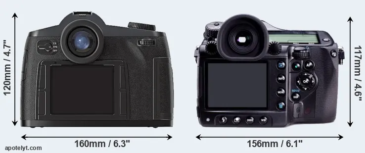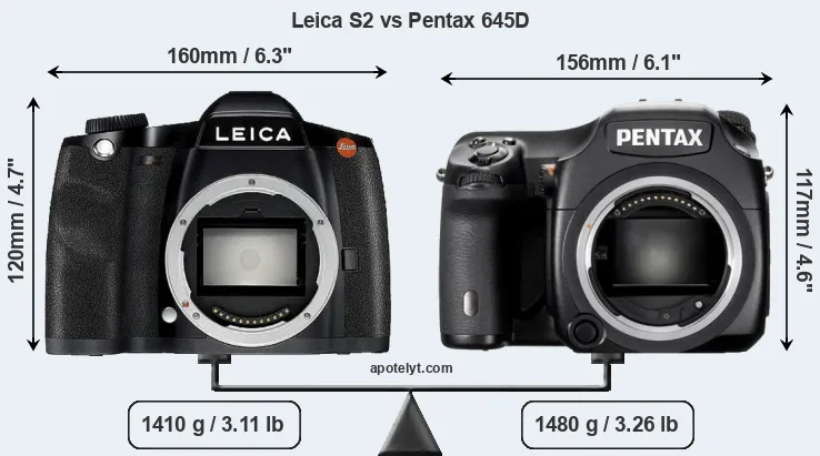 The side-by-side display below illustrates the physical size and weight of the Leica S2 and the Pentax 645D. The two cameras are presented according to their relative size. Three consecutive views from the front, the top, and the rear side are shown. All width, height and depth measures are rounded to the nearest millimeter.