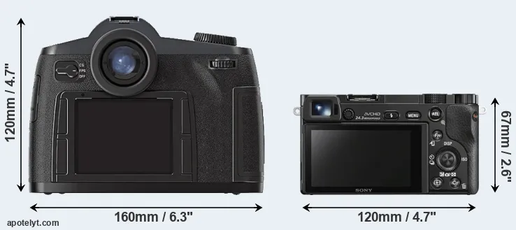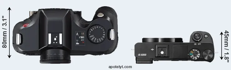 The side-by-side display below illustrates the physical size and weight of the Leica S2 and the Sony A6000. The two cameras are presented according to their relative size. Three consecutive perspectives from the front, the top, and the back are available. All width, height and depth measures are rounded to the nearest millimeter.