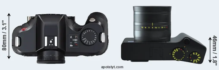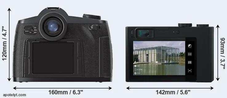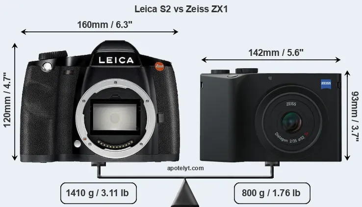 The physical size and weight of the Leica S2 and the Zeiss ZX1 are illustrated in the side-by-side display below. The two cameras are presented according to their relative size. Three consecutive perspectives from the front, the top, and the back are available. All width, height and depth measures are rounded to the nearest millimeter.