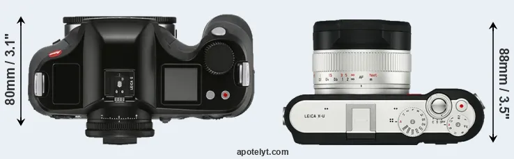 The physical size and weight of the Leica S3 and the Leica X-U Typ 113 are illustrated in the side-by-side display below. The two cameras are presented according to their relative size. Three consecutive perspectives from the front, the top, and the back are available. All width, height and depth measures are rounded to the nearest millimeter.