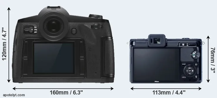 An illustration of the physical size and weight of the Leica S3 and the Nikon 1 V1 is provided in the side-by-side display below. The two cameras are presented according to their relative size. Three successive views from the front, the top, and the rear are shown. All width, height and depth dimensions are rounded to the nearest millimeter.