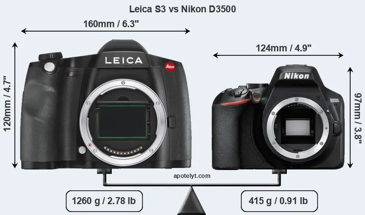 If the front view area (width x height) of the cameras is taken as an aggregate measure of their size, the Nikon D3500 is considerably smaller (37 percent) than the Leica S3. Moreover, the D3500 is substantially lighter (67 percent) than the S3. It is worth mentioning in this context that the S3 is splash and dust resistant, while the D3500 does not feature any corresponding weather-sealing.