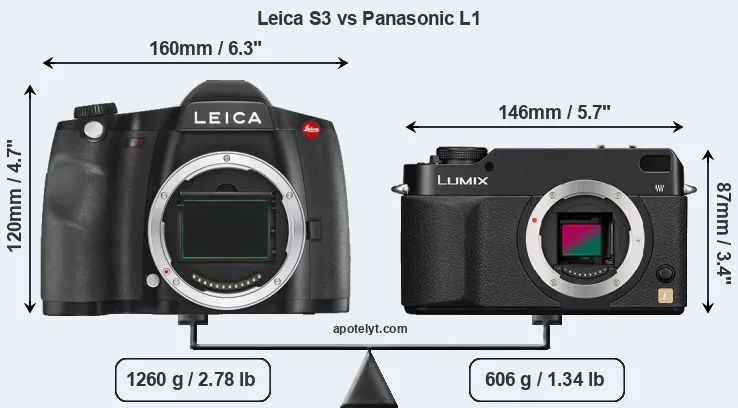 If the front view area (width x height) of the cameras is taken as an aggregate measure of their size, the Panasonic L1 is considerably smaller (34 percent) than the Leica S3. Moreover, the L1 is substantially lighter (52 percent) than the S3. It is worth mentioning in this context that the S3 is splash and dust resistant, while the L1 does not feature any corresponding weather-sealing.