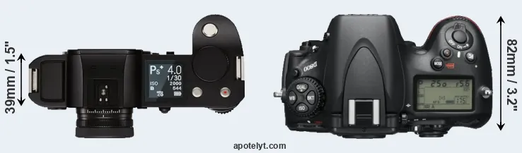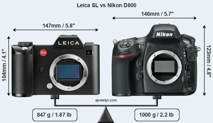 An illustration of the physical size and weight of the Leica SL and the Nikon D800 is provided in the side-by-side display below. The two cameras are presented according to their relative size. Three consecutive views from the front, the top, and the rear side are shown. All width, height and depth dimensions are rounded to the nearest millimeter.