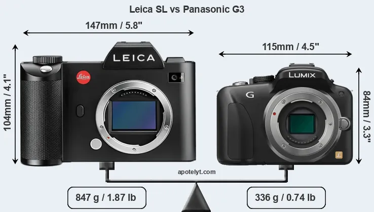 If the front view area (width x height) of the cameras is taken as an aggregate measure of their size, the Panasonic G3 is considerably smaller (37 percent) than the Leica SL. Moreover, the G3 is substantially lighter (60 percent) than the Leica SL. It is worth mentioning in this context that the Leica SL is splash and dust resistant, while the G3 does not feature any corresponding weather-sealing.