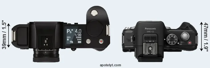 The physical size and weight of the Leica SL and the Panasonic G3 are illustrated in the side-by-side display below. The two cameras are presented according to their relative size. Three consecutive perspectives from the front, the top, and the back are available. All width, height and depth measures are rounded to the nearest millimeter.
