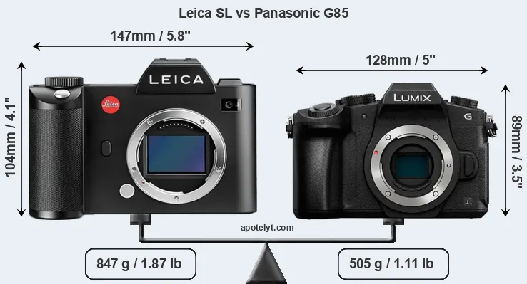 If the front view area (width x height) of the cameras is taken as an aggregate measure of their size, the Panasonic G85 is notably smaller (25 percent) than the Leica SL. Moreover, the G85 is substantially lighter (40 percent) than the Leica SL. In this context, it is worth noting that both cameras are splash and dust-proof and can, hence, be used in inclement weather conditions or harsh environments.