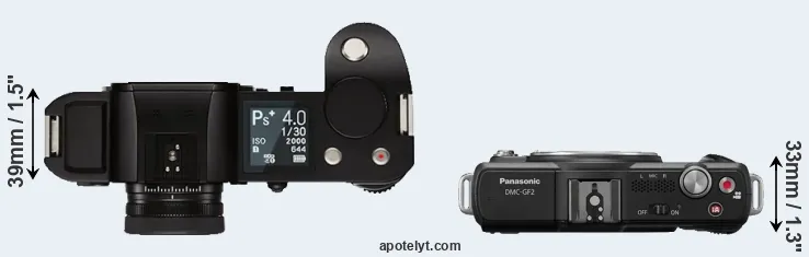The side-by-side display below illustrates the physical size and weight of the Leica SL and the Panasonic GF2. The two cameras are presented according to their relative size. Three consecutive views from the front, the top, and the rear side are shown. All width, height and depth dimensions are rounded to the nearest millimeter.