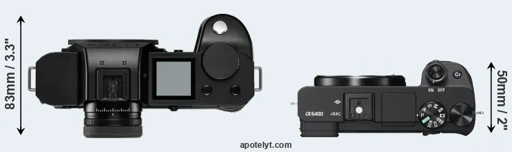 The side-by-side display below illustrates the physical size and weight of the Leica SL2-S and the Sony A6400. The two cameras are presented according to their relative size. Three consecutive views from the front, the top, and the rear side are shown. All width, height and depth dimensions are rounded to the nearest millimeter.