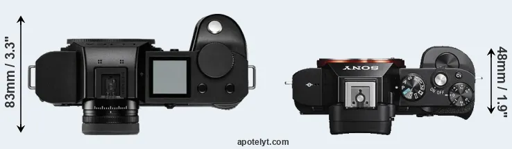 The side-by-side display below illustrates the physical size and weight of the Leica SL2-S and the Sony A7S. The two cameras are presented according to their relative size. Three consecutive views from the front, the top, and the rear side are shown. All width, height and depth dimensions are rounded to the nearest millimeter.