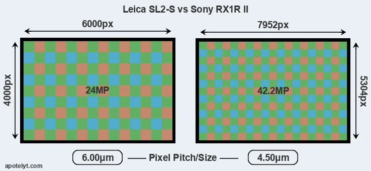 Despite having a slightly smaller sensor, the RX1R II offers a higher resolution of 42.2 megapixels, compared with 24 MP of the Leica SL2-S. This megapixels advantage comes at the cost of a higher pixel density and a smaller size of the individual pixel (with a pixel pitch of 4.50μm versus 6.00μm for the Leica SL2-S). Moreover, it should be noted that the Leica SL2-S is much more recent (by 5 years and 1 month) than the RX1R II, and its sensor will have benefitted from technological advances during this time that further enhance the light gathering capacity of its pixels. Coming back to sensor resolution, it should be mentioned that neither of the two cameras has an anti-alias filter installed, so they are able to capture all the detail the sensor resolves.