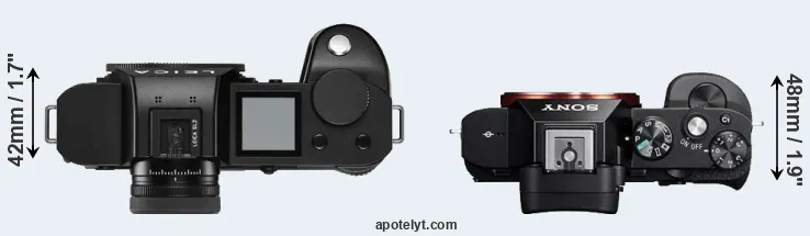 The side-by-side display below illustrates the physical size and weight of the Leica SL2 and the Sony A7R. The two cameras are presented according to their relative size. Three consecutive views from the front, the top, and the rear side are shown. All width, height and depth dimensions are rounded to the nearest millimeter.