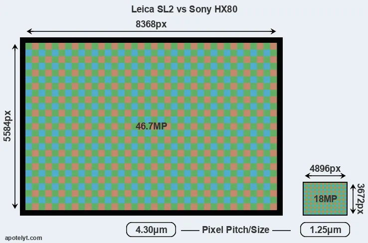 Of the two cameras under consideration, the Leica SL2 features a full frame sensor and the Sony HX80 a 1/2.3-inch sensor. The sensor area in the HX80 is 97 percent smaller. As a result of these sensor size differences, the cameras have a format factor of, respectively, 1.0 and 5.6. The sensor in the Leica SL2 has a native 3:2 aspect ratio, while the one in the HX80 offers a 4:3 aspect.