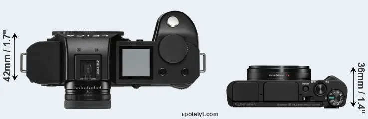 The physical size and weight of the Leica SL2 and the Sony HX95 are illustrated in the side-by-side display below. The two cameras are presented according to their relative size. Three consecutive views from the front, the top, and the rear side are shown. All size dimensions are rounded to the nearest millimeter.