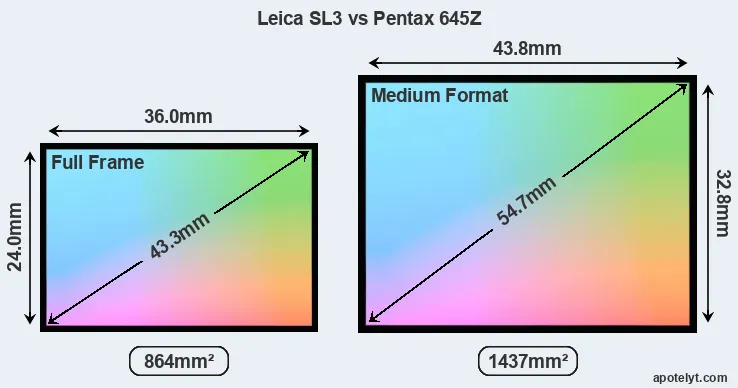 Of the two cameras under consideration, the Leica SL3 features a full frame sensor and the Pentax 645Z a medium format sensor. The sensor area in the 645Z is 66 percent bigger. As a result of these sensor size differences, the cameras have a format factor of, respectively, 1.0 and 0.79. The sensor in the Leica SL3 has a native 3:2 aspect ratio, while the one in the 645Z offers a 4:3 aspect.