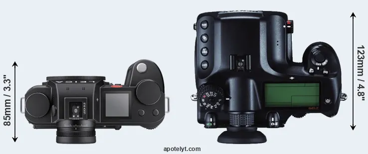 The physical size and weight of the Leica SL3 and the Pentax 645Z are illustrated in the side-by-side display below. The two cameras are presented according to their relative size. Three consecutive views from the front, the top, and the rear side are shown. All size dimensions are rounded to the nearest millimeter.
