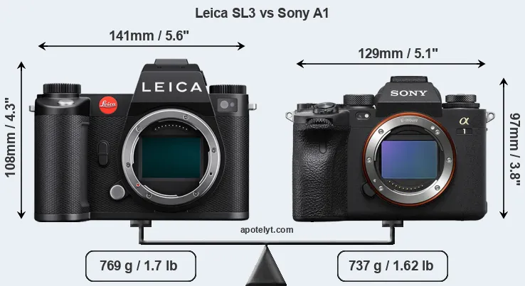 The side-by-side display below illustrates the physical size and weight of the Leica SL3 and the Sony A1. The two cameras are presented according to their relative size. Three successive views from the front, the top, and the rear are shown. All width, height and depth dimensions are rounded to the nearest millimeter.