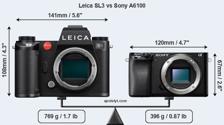 If the front view area (width x height) of the cameras is taken as an aggregate measure of their size, the Sony A6100 is considerably smaller (47 percent) than the Leica SL3. Moreover, the A6100 is substantially lighter (54 percent) than the Leica SL3. It is worth mentioning in this context that the Leica SL3 is splash and dust resistant, while the A6100 does not feature any corresponding weather-sealing.