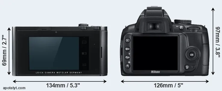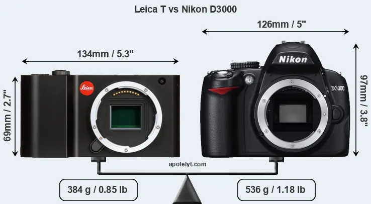 The side-by-side display below illustrates the physical size and weight of the Leica T and the Nikon D3000. The two cameras are presented according to their relative size. Three consecutive perspectives from the front, the top, and the back are available. All width, height and depth measures are rounded to the nearest millimeter.