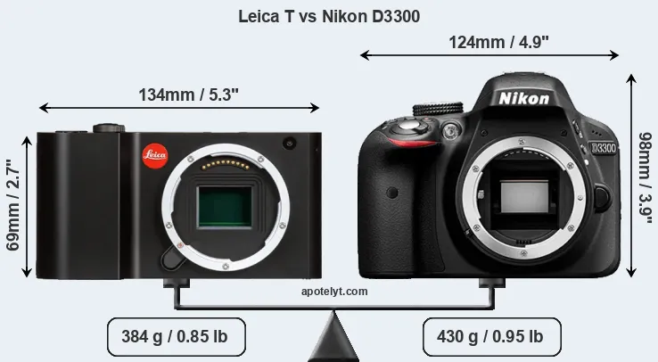 If the front view area (width x height) of the cameras is taken as an aggregate measure of their size, the Nikon D3300 is notably larger (31 percent) than the Leica T. Moreover, the D3300 is markedly heavier (12 percent) than the T Typ 701. In this context, it is worth noting that neither the T Typ 701 nor the D3300 are weather-sealed.