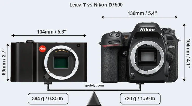 If the front view area (width x height) of the cameras is taken as an aggregate measure of their size, the Nikon D7500 is considerably larger (53 percent) than the Leica T. Moreover, the D7500 is substantially heavier (88 percent) than the T Typ 701. It is noteworthy in this context that the D7500 is splash and dust-proof, while the T Typ 701 does not feature any corresponding weather-sealing.