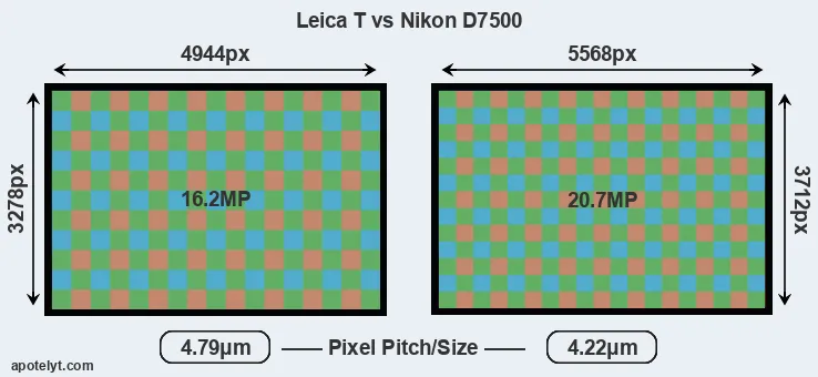 Despite having a slightly smaller sensor, the D7500 offers a higher resolution of 20.7 megapixels, compared with 16.2 MP of the T Typ 701. This megapixels advantage comes at the cost of a higher pixel density and a smaller size of the individual pixel (with a pixel pitch of 4.22μm versus 4.79μm for the T Typ 701). However, it should be noted that the D7500 is much more recent (by 2 years and 11 months) than the T Typ 701, and its sensor will have benefitted from technological advances during this time that make it possible to gather light more efficiently. Coming back to sensor resolution, it should be mentioned that neither of the two cameras has an anti-alias filter installed, so they are able to capture all the detail the sensor resolves.