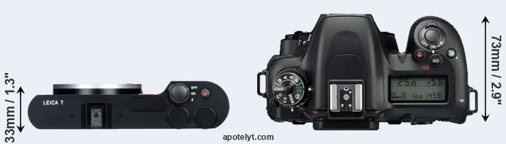 An illustration of the physical size and weight of the Leica T and the Nikon D7500 is provided in the side-by-side display below. The two cameras are presented according to their relative size. Three consecutive perspectives from the front, the top, and the back are available. All size dimensions are rounded to the nearest millimeter.
