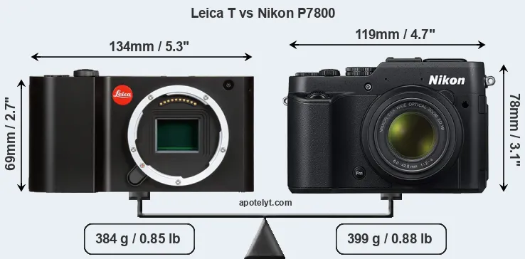 The physical size and weight of the Leica T and the Nikon P7800 are illustrated in the side-by-side display below. The two cameras are presented according to their relative size. Three consecutive perspectives from the front, the top, and the back are available. All width, height and depth dimensions are rounded to the nearest millimeter.