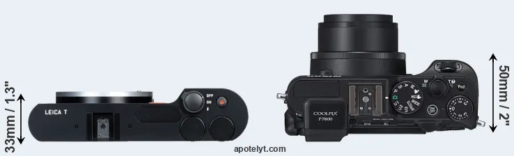 If the front view area (width x height) of the cameras is taken as an aggregate measure of their size, the Leica T and the Nikon P7800 are of equal size. In this context, it is worth noting that neither the T Typ 701 nor the P7800 are weather-sealed.