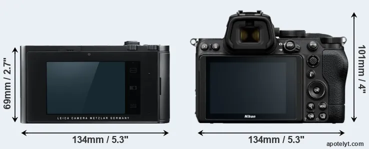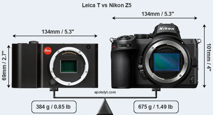 The physical size and weight of the Leica T and the Nikon Z5 are illustrated in the side-by-side display below. The two cameras are presented according to their relative size. Three consecutive perspectives from the front, the top, and the back are available. All width, height and depth measures are rounded to the nearest millimeter.