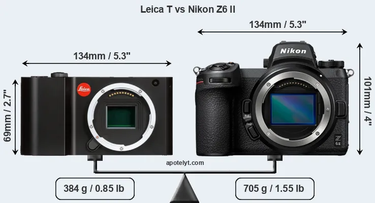 An illustration of the physical size and weight of the Leica T and the Nikon Z6 II is provided in the side-by-side display below. The two cameras are presented according to their relative size. Three consecutive views from the front, the top, and the rear side are shown. All width, height and depth measures are rounded to the nearest millimeter.