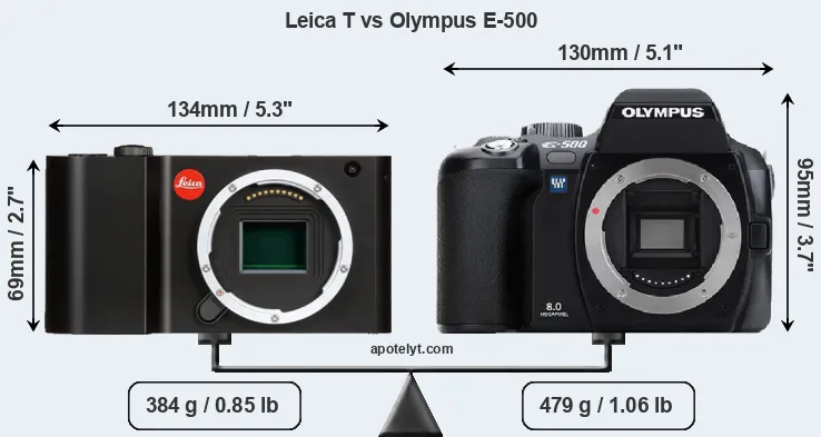 If the front view area (width x height) of the cameras is taken as an aggregate measure of their size, the Olympus E-500 is notably larger (34 percent) than the Leica T. Moreover, the E-500 is markedly heavier (25 percent) than the T Typ 701. In this context, it is worth noting that neither the T Typ 701 nor the E-500 are weather-sealed.