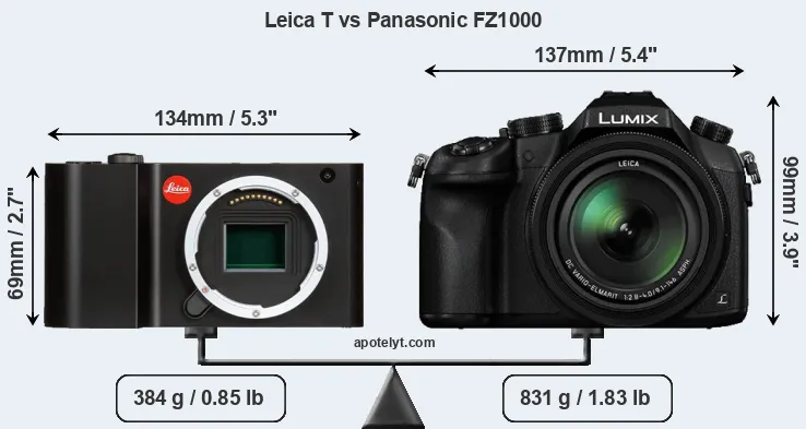 The physical size and weight of the Leica T and the Panasonic FZ1000 are illustrated in the side-by-side display below. The two cameras are presented according to their relative size. Three successive views from the front, the top, and the rear are shown. All width, height and depth measures are rounded to the nearest millimeter.