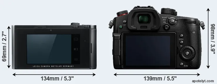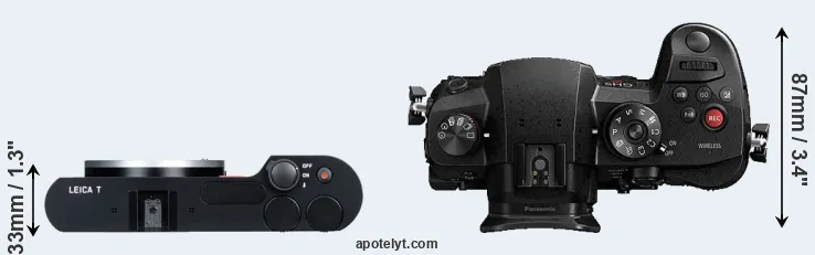 If the front view area (width x height) of the cameras is taken as an aggregate measure of their size, the Panasonic GH5s is considerably larger (47 percent) than the Leica T. Moreover, the GH5s is substantially heavier (72 percent) than the T Typ 701. It is noteworthy in this context that the GH5s is splash and dust-proof, while the T Typ 701 does not feature any corresponding weather-sealing.