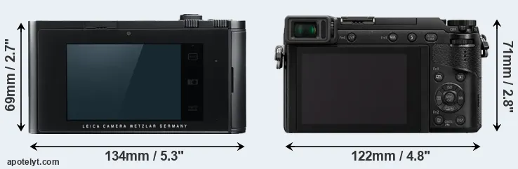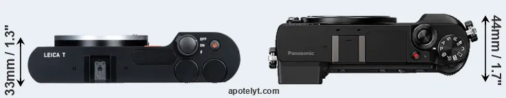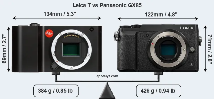 The side-by-side display below illustrates the physical size and weight of the Leica T and the Panasonic GX85. The two cameras are presented according to their relative size. Three successive views from the front, the top, and the rear are shown. All size dimensions are rounded to the nearest millimeter.