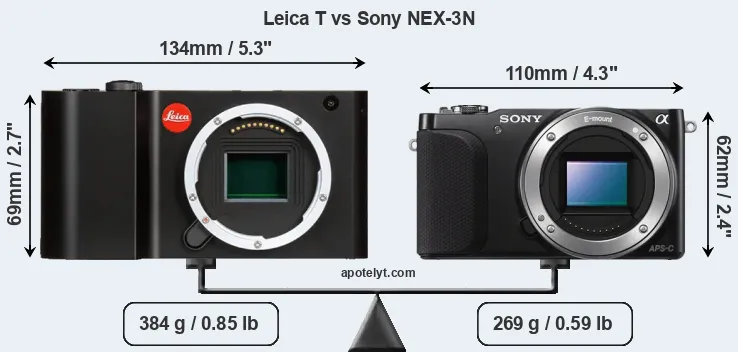 If the front view area (width x height) of the cameras is taken as an aggregate measure of their size, the Sony NEX-3N is notably smaller (26 percent) than the Leica T. Moreover, the NEX-3N is markedly lighter (30 percent) than the T Typ 701. In this context, it is worth noting that neither the T Typ 701 nor the NEX-3N are weather-sealed.