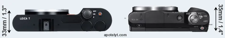 The physical size and weight of the Leica T and the Sony NEX-3N are illustrated in the side-by-side display below. The two cameras are presented according to their relative size. Three successive views from the front, the top, and the rear are shown. All width, height and depth measures are rounded to the nearest millimeter.