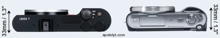 The physical size and weight of the Leica T and the Sony NEX-C3 are illustrated in the side-by-side display below. The two cameras are presented according to their relative size. Three successive views from the front, the top, and the rear are shown. All width, height and depth measures are rounded to the nearest millimeter.