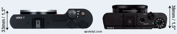 If the front view area (width x height) of the cameras is taken as an aggregate measure of their size, the Sony RX100 II is considerably smaller (36 percent) than the Leica T. In this context, it is worth noting that neither the T Typ 701 nor the RX100 II are weather-sealed.