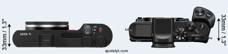 An illustration of the physical size and weight of the Leica TL and the Nikon 1 V3 is provided in the side-by-side display below. The two cameras are presented according to their relative size. Three successive views from the front, the top, and the rear are shown. All width, height and depth dimensions are rounded to the nearest millimeter.