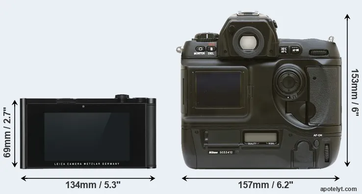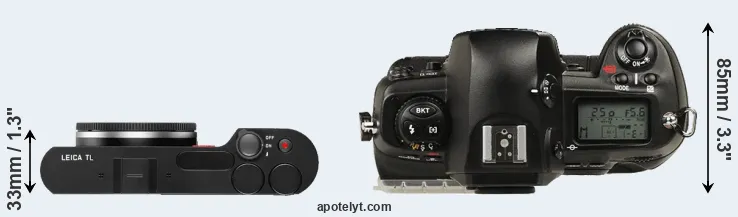 If the front view area (width x height) of the cameras is taken as an aggregate measure of their size, the Nikon D1 is considerably larger (160 percent) than the Leica TL. Moreover, the D1 is substantially heavier (186 percent) than the TL. It is noteworthy in this context that the D1 is splash and dust-proof, while the TL does not feature any corresponding weather-sealing.
