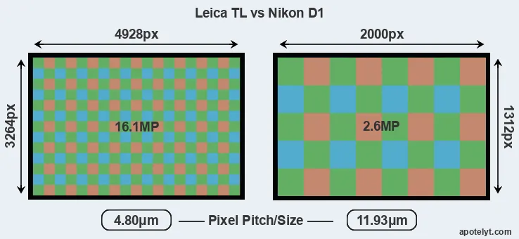 With 16.1MP, the TL offers a higher resolution than the D1 (2.6MP), but the TL has smaller individual pixels (pixel pitch of 4.80μm versus 11.93μm for the D1). However, the TL is a much more recent model (by 17 years and 4 months) than the D1, and its sensor will have benefitted from technological advances during this time that enhance the light gathering capacity of its pixels. Coming back to sensor resolution, it should be mentioned that the TL has no anti-alias filter installed, so that it can capture all the detail its sensor resolves.