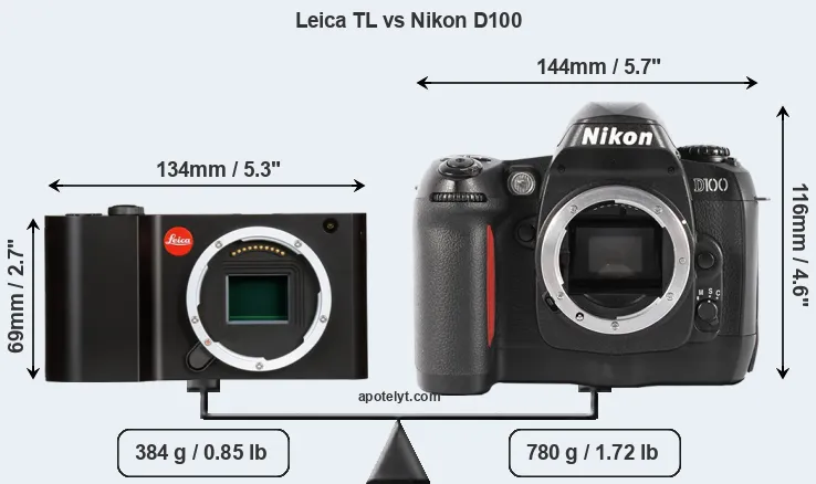 If the front view area (width x height) of the cameras is taken as an aggregate measure of their size, the Nikon D100 is considerably larger (81 percent) than the Leica TL. Moreover, the D100 is substantially heavier (103 percent) than the TL. In this context, it is worth noting that neither the TL nor the D100 are weather-sealed.