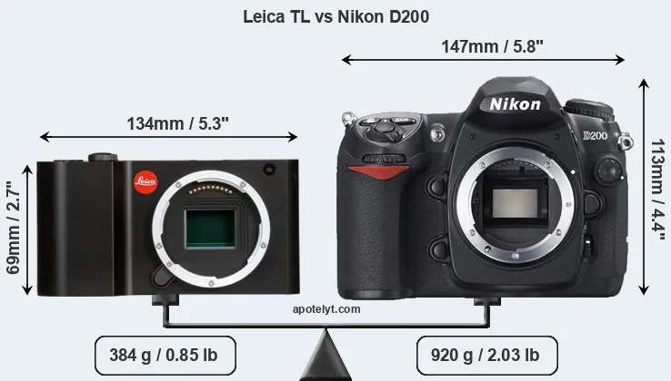 If the front view area (width x height) of the cameras is taken as an aggregate measure of their size, the Nikon D200 is considerably larger (80 percent) than the Leica TL. Moreover, the D200 is substantially heavier (140 percent) than the TL. It is noteworthy in this context that the D200 is splash and dust-proof, while the TL does not feature any corresponding weather-sealing.