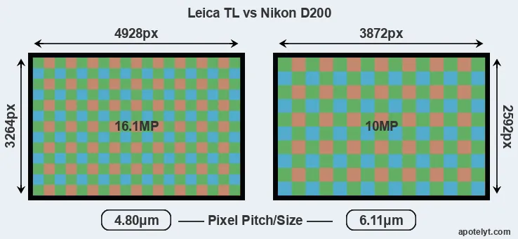 Despite having a slightly smaller sensor, the Leica TL offers a higher resolution of 16.1 megapixels, compared with 10 MP of the Nikon D200. This megapixels advantage comes at the cost of a higher pixel density and a smaller size of the individual pixel (with a pixel pitch of 4.80μm versus 6.11μm for the D200). However, it should be noted that the TL is much more recent (by 11 years) than the D200, and its sensor will have benefitted from technological advances during this time that make it possible to gather light more efficiently. Coming back to sensor resolution, it should be mentioned that the TL has no anti-alias filter installed, so that it can capture all the detail its sensor resolves.